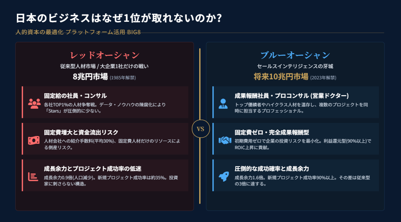 つまり、賃料削減も店舗開発も、もはや単なるコスト管理や不動産業務ではない。そこには、企業のブランド、顧客体験、財務構造、そして将来の事業成長がすべて結びついている。フルコミッション型の外部コンサルは、その複雑な要素を横断的に設計・実行できる唯一の存在である。彼らは削減する者ではなく、再構築する者であり、固定費を削りながら企業の成長ポテンシャルを再創造する存在である。したがって、セールスインテリジェンスを活用することの意義は明確である。それは、削減を通じて創造を起こす戦略的構造改革を企業にもたらすということだ。人的資本である内部と外部、コストと価値。その境界を越えて動的に再設計できる企業こそが、真の競争優位を手にするのである。